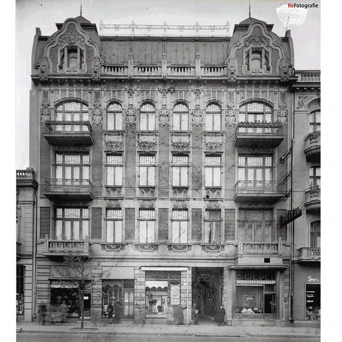 W miejscu parterowego drewniaka, widocznego jeszcze na trzecim zdjęciu w galerii, małżonkowie wystawili trzypiętrową kamienicę frontową. Projekt budynku wykonał znany łódzki architekt Gustaw Landau-Gutenteger, którego pracownia mieściła się w podwórzu tego numeru.