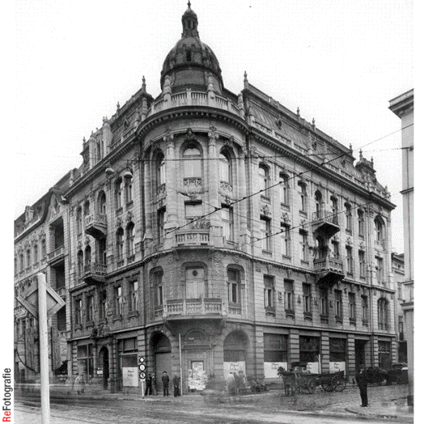 Okazały budynek narożny, łączący cechy neobarokowe i secesyjne, wzniesiono w 1903 r. według projektu Gustawa Landau-Gutentegera. Parter zajmowały lokale handlowe, na pierwszym piętrze mieścił się Dom Bankowy, a pozostałe pomieszczenia przeznaczono na ekskluzywne mieszkania.